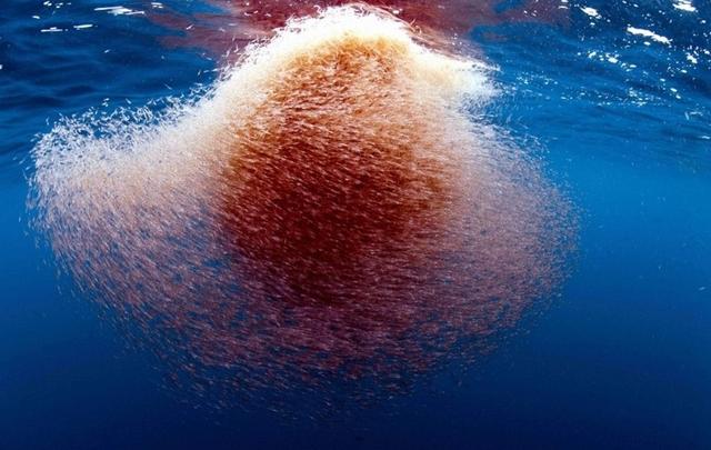 在繁殖季节,南极磷虾可以完成非常壮观的水上表演,每立方米的水可以达到10000 至 60000 只个体,把整片海域都染红,太空中的卫星都能拍到这样的情景。