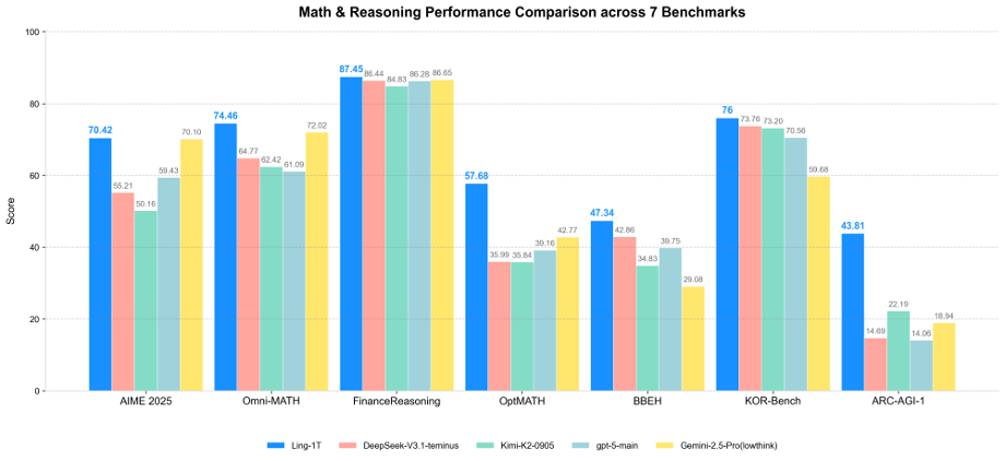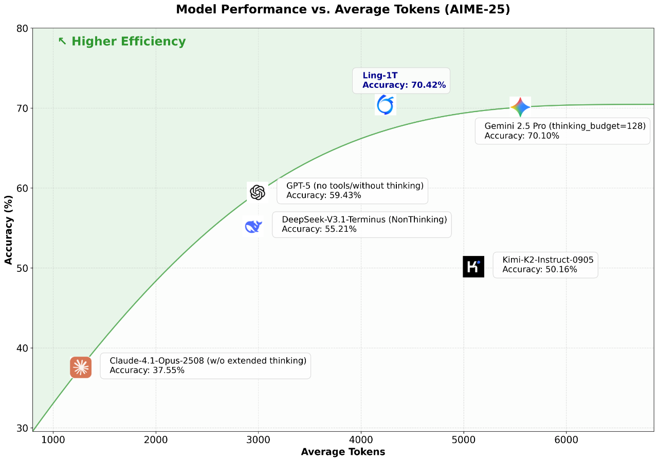 • Ling-1T:准确率 70.42%,平均推理长度约 4300 tokens