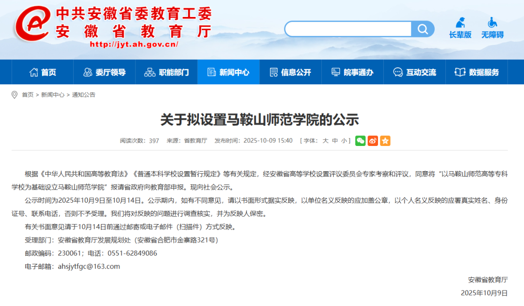 10月9日,安徽省教育厅发布《关于拟设置马鞍山师范学院的公示》,将“以马鞍山师范高等专科学校为基础设立马鞍山师范学院”报请省政府向教育部申报,现予以公示。
