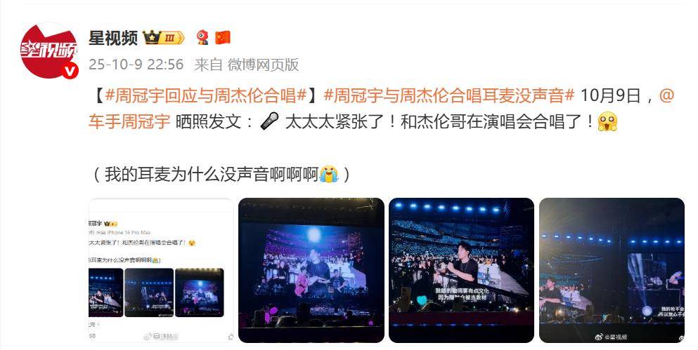 演出结束后,意犹未尽的周冠宇立刻在微博上发文,情绪复杂地写道:“太太太紧张了!和杰伦哥在演唱会合唱了!(我的耳麦为什么没声音啊啊啊)”。这条带着强烈情绪和现场照片的微博,瞬间引发了全网共鸣。字里行间,既有与偶像同台的兴奋,也夹杂着设备掉链子的无奈和遗憾。