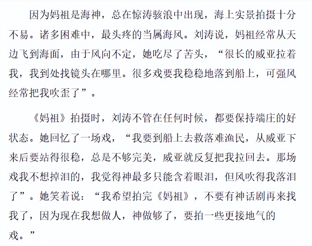 甚至为了呈现出真实的海上场景,刘涛常常要在海上吊着威亚进行拍摄。