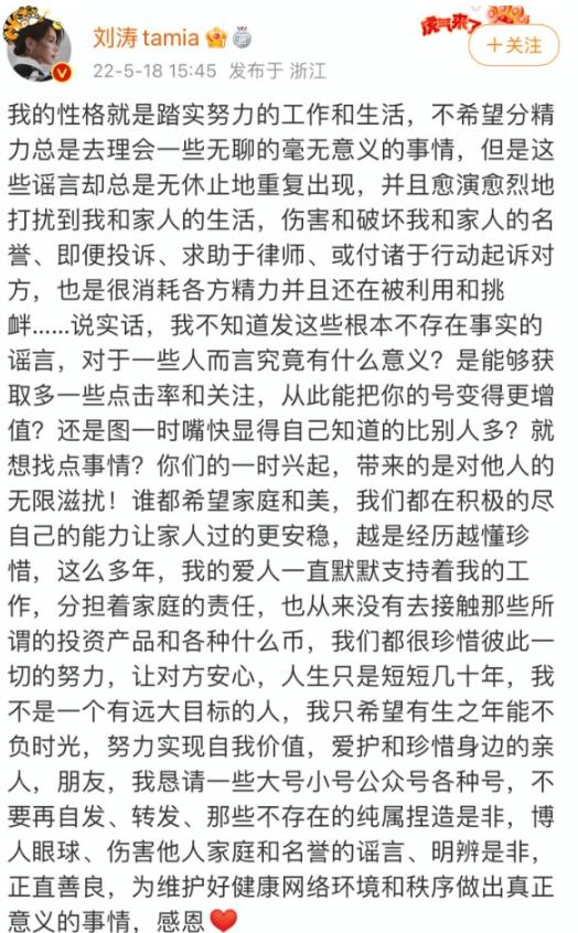 几年前更是有博主爆料称刘涛因为男方炒币血亏,双方在协议离婚。