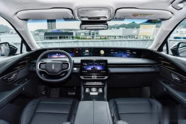 林肯航海家启航版的内饰同样和中高配车型没有明显差异,中控台为环抱座舱布局,车内使用大量软性材质覆盖和皮质/真皮包裹,中控台前方提供23.6英寸贯通式液晶屏,还配备了11.1英寸中控屏,车机内置高通骁龙8155芯片,支持语音双区域唤醒识别、语音连续识别、可见即可说等功能,副仪表台设有按键换挡机构和实体按键与旋钮。