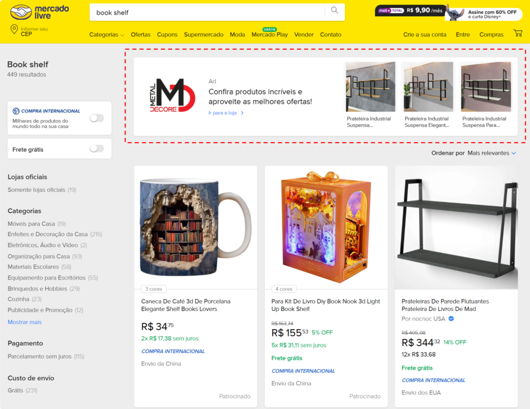 品牌广告是美客多目前唯一以关键词竞价投放的广告类型。它允许卖家通过关键词投放,在最优的广告位展示品牌的Logo、标语和多款产品,并将用户直接引导至品牌的专属旗舰店。