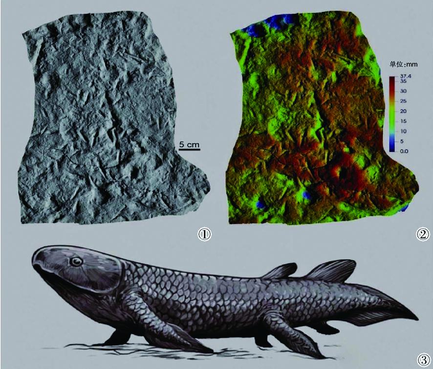 图①②:3D扫描显示的沉积层肺鱼足迹印痕。图③:远古肺鱼复原图。