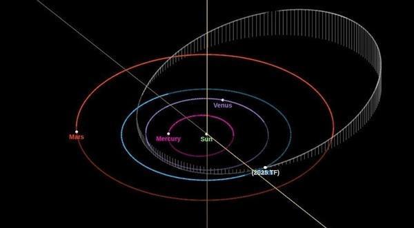 轨道参数揭示了2025 TF的"太空流浪者"特性:其运行轨迹呈显著椭圆形,半长轴达1.62个天文单位(约2.42亿公里),近日点深入金星轨道内侧(0.676 AU),远日点则延伸至火星轨道外侧(2.56 AU)。这种跨越内太阳系的轨道使其每2.06年就会与地球轨道产生一次交集,9.1度的轨道倾角则增加了轨道预测的复杂性。天文学家指出,这类"阿波罗型"近地小行星约占已知近地天体的60%,是潜在撞击风险的主要来源。