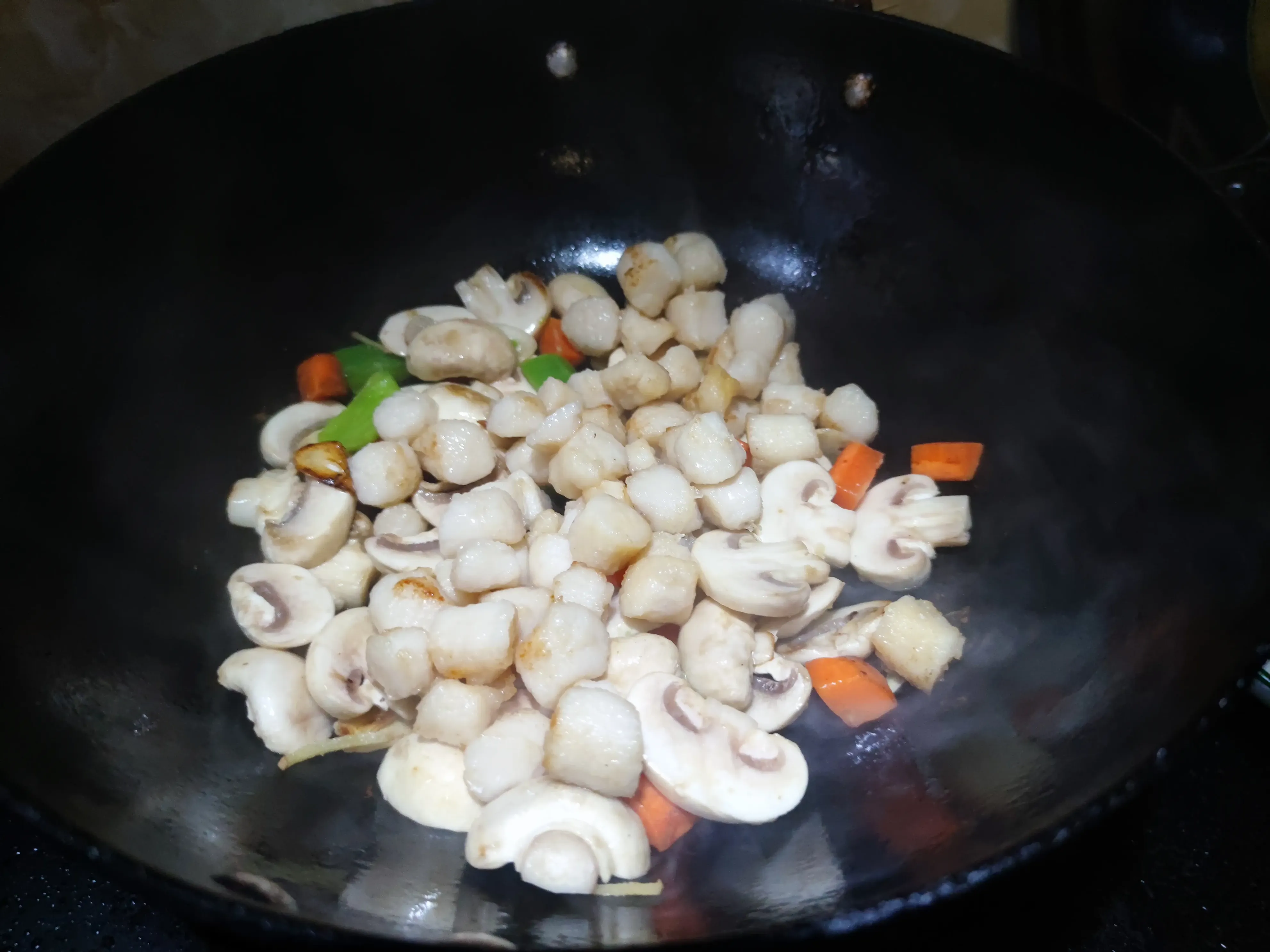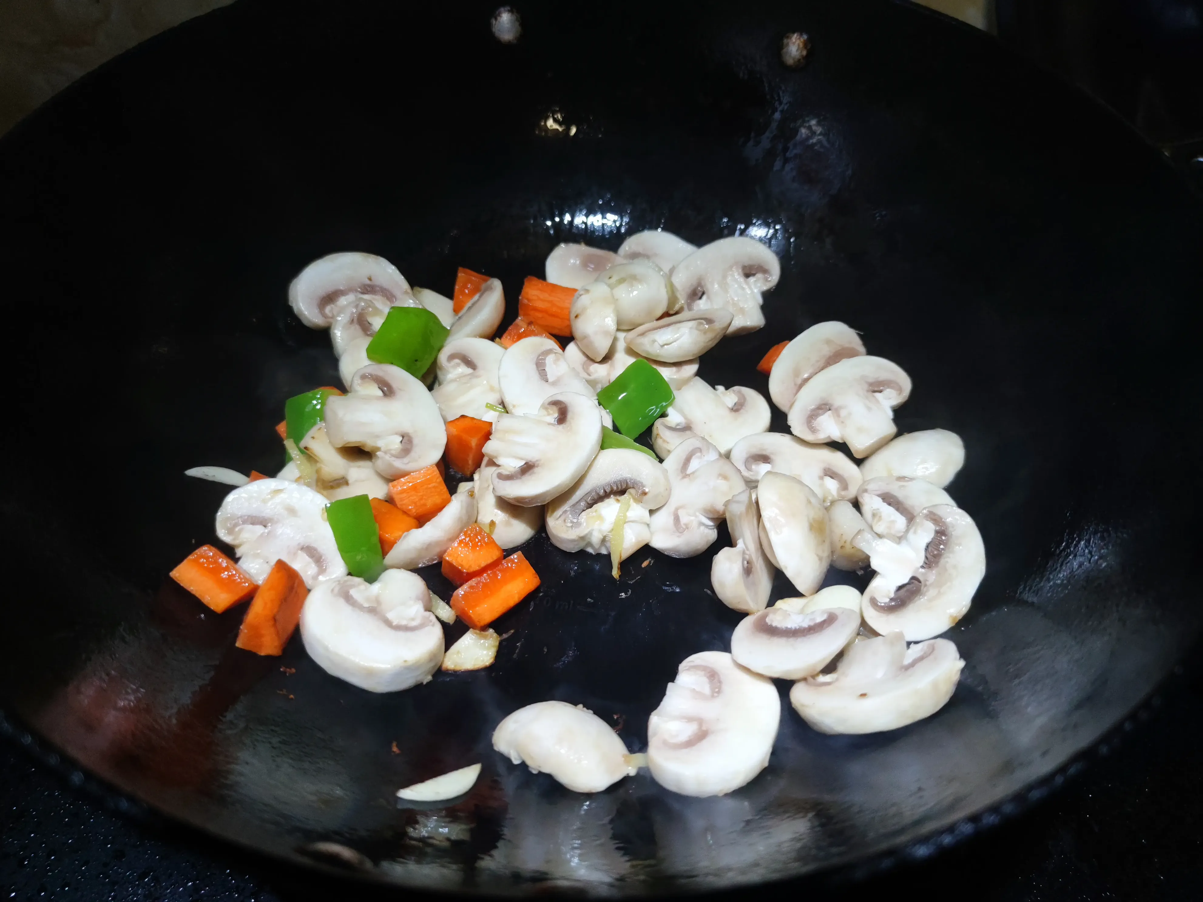 3.锅中留底油爆香葱姜蒜,下入口蘑和胡萝卜丁煸炒均匀,炒至口蘑表皮微微发黄后,烹入料酒和蚝油炒匀。
