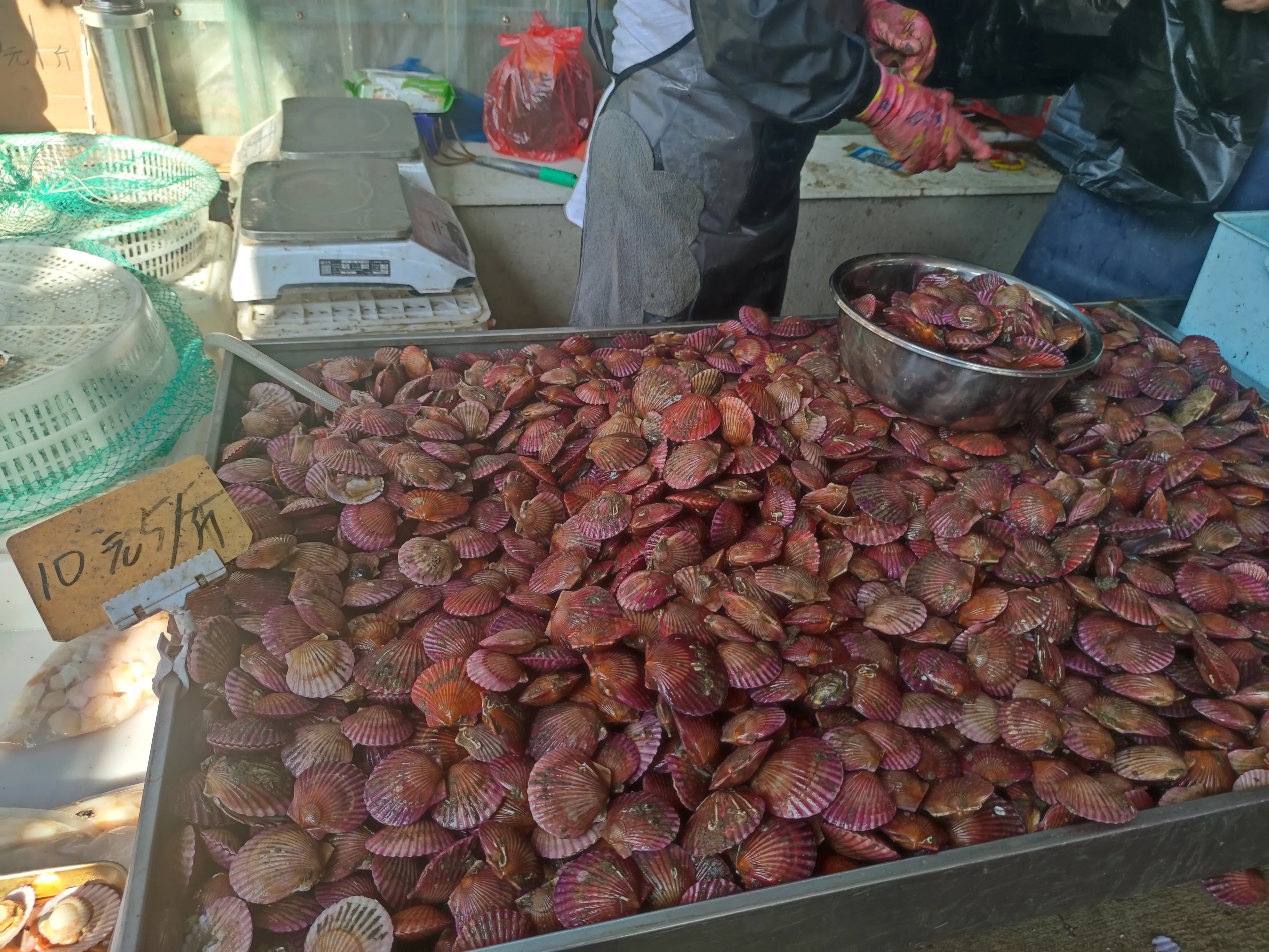 现在市面上售卖的扇贝基本都是养殖的,主要有最大个头的虾贻贝,以及浑身布满栉孔的栉孔贝和红色的港湾贝,而每年的十月份都是红色的港湾贝收获时候。