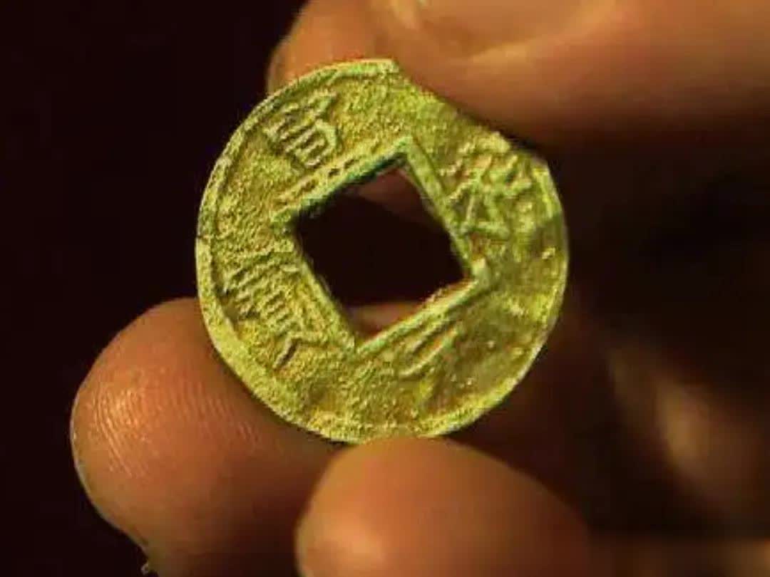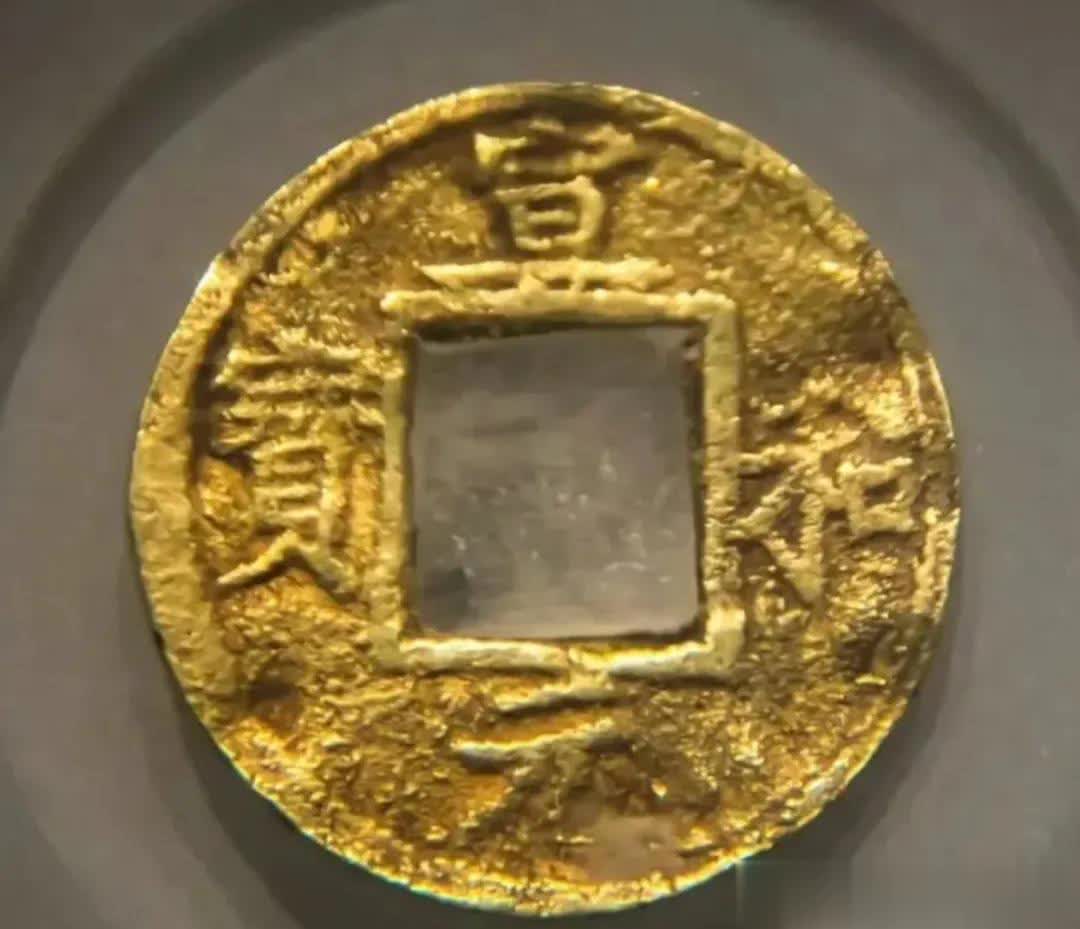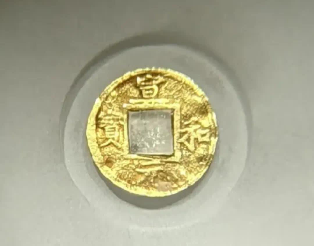 他弯腰捡起来,发现是一枚颜色暗沉,却隐隐透着黄光的圆形方孔钱。心里便琢磨:“这不会是金子吧?”