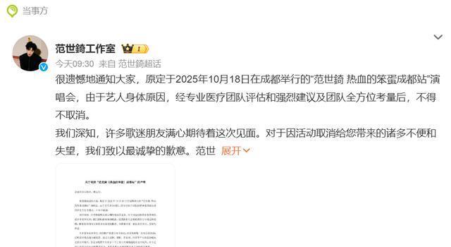 近日,一则娱乐消息引发了众多粉丝和网友的广泛关注——范世琦原定于2025年10月18日在成都举办的“热血的笨蛋”演唱会已正式取消。这一消息瞬间在网络上掀起了不小的波澜,各方反应不一。