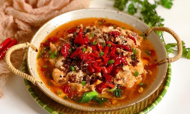 最后将鱼片捞出,放在配菜上,舀一勺汤汁,不要没过鱼片,再放入花椒粒、辣椒段、白芝麻,烧热油浇在上面,撒上葱花,就可以食用了。