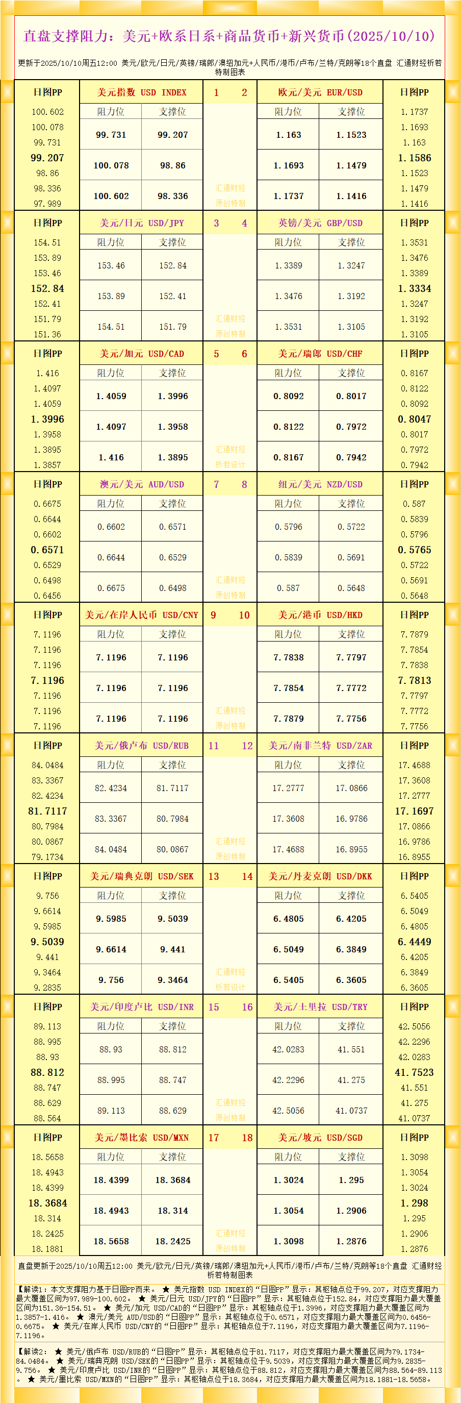 一张图看直盘支撑阻力:美元+欧系日系+商品货币+新兴货币,更新于2025年10月10日周五12:00,具体美元/欧元/日元/英镑/瑞郎/澳纽加元+人民币/港币/卢布/兰特/克朗等18个直盘,更多详见汇通财经析若特制图表中的内容。