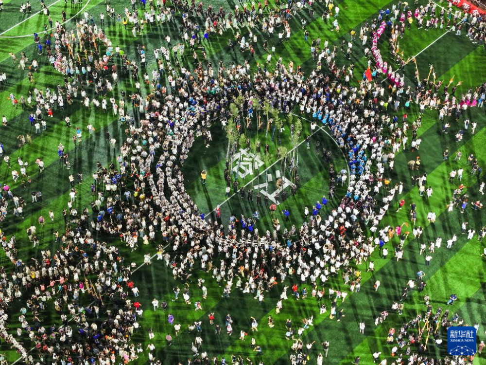 ▲2025年8月23日,人们在贵州“村超”球场跳苗族芦笙舞(无人机照片)。新华社记者 杨文斌 摄