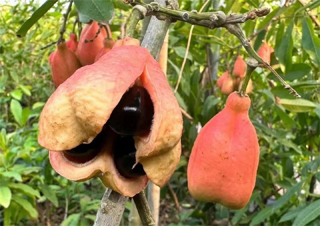 这模样,倒和苹婆有些像——两者都是红色果皮,成熟后都会裂开,里面都藏着黑色的种子。