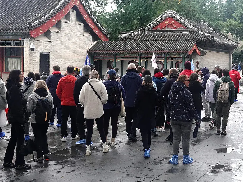 2025年10月9日,北京持续降雨降温天气,中外游客穿冬装游览颐和园。(视觉中国供图)