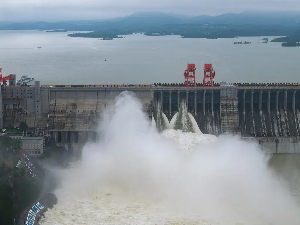2025年10月5日,湖北十堰,丹江口水库泄洪。(视觉中国供图)