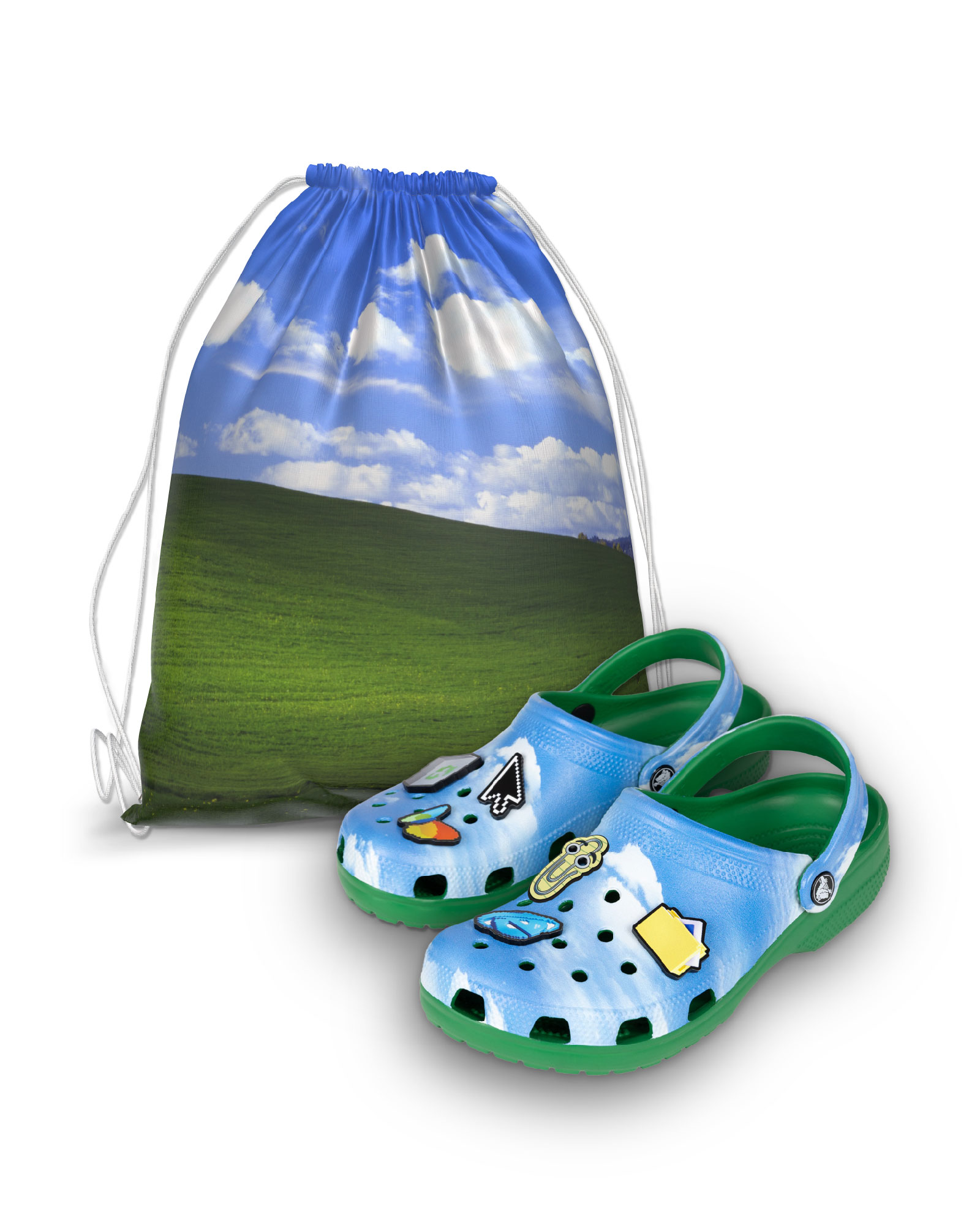 这款 Crocs 洞洞鞋复刻了 Windows XP 桌面壁纸的经典蓝天白云图案,鞋底为草绿色,与壁纸上那片广受大家熟悉的“草地”相呼应。鞋身还配有六枚微软主题 Jibbitz 鞋饰,包括 MSN 旧标、Internet Explorer 图标、办公助手 Clippy 以及鼠标指针等元素,充满了怀旧感。同时,购买者还可获赠一只 Windows XP 主题抽绳背包。