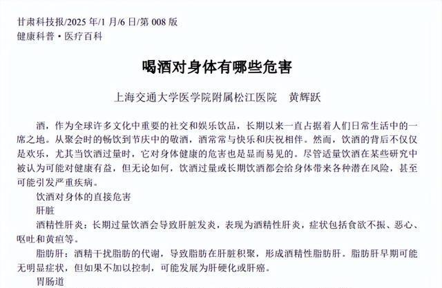 喝酒对身体有哪些危害 黄辉跃 甘肃科技报2025-01-06