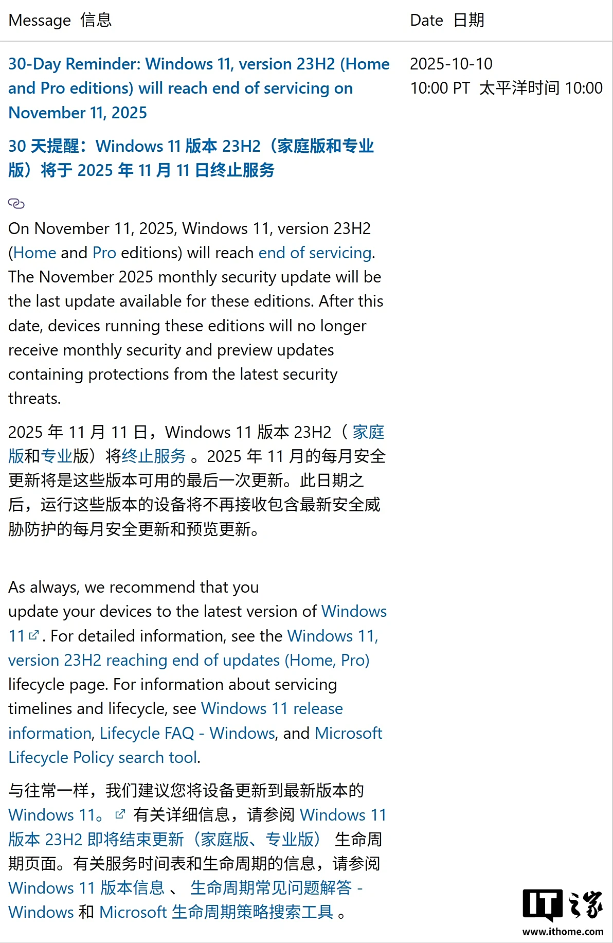 IT之家 10 月 11 日消息,科技媒体 bleepingcomputer 昨日(10 月 10 日)发布博文,报道称微软发出提醒,Windows 11 23H2 家庭版和专业版进入 30 天倒计时,该系统版本 11 月 11 日结束服务支持。