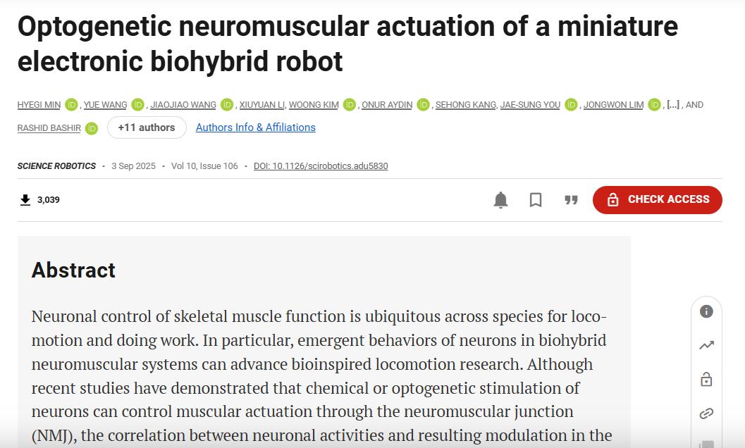 近日,发表于《科学·机器人》的一项突破性研究,对这一问题给出了初步答案。美国伊利诺伊大学香槟分校、西北大学等机构的联合团队,成功开发出一款光遗传调控的神经肌肉驱动生物混合爬行机器人,在现实世界中迈出了"湿件"控制机器的关键一步。