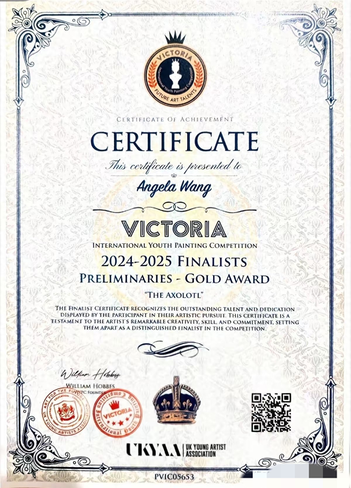 这次王诗龄凭借作品《蝾螈》拿下“维多利亚国际青少年绘画金奖”,同时入围决赛。