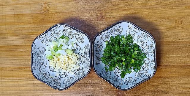 【步骤三】:把大蒜拍碎切成蒜末、香葱葱白和葱叶子分开切成末,分别装盘备用。