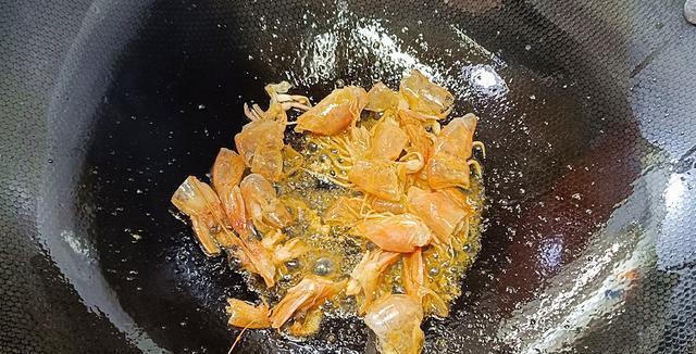 【步骤四】:锅中放油烧热,把虾头和虾皮放入锅中,把虾油炒出来,放入蒜末和葱白炒出香味。