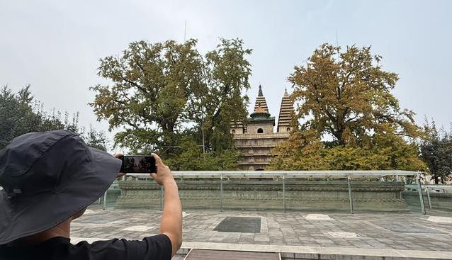 最近,真觉寺火了,尤其是国庆假期。武汉来的王先生,特意跑来看塔和树。他站在树下,抬头看半黄的银杏叶,旁边还有柿子树,红彤彤的果子挂满枝头。“这场景,太美了!”他说,拍了张照片,银杏叶、柿子和冷灰色的塔,完美入镜。