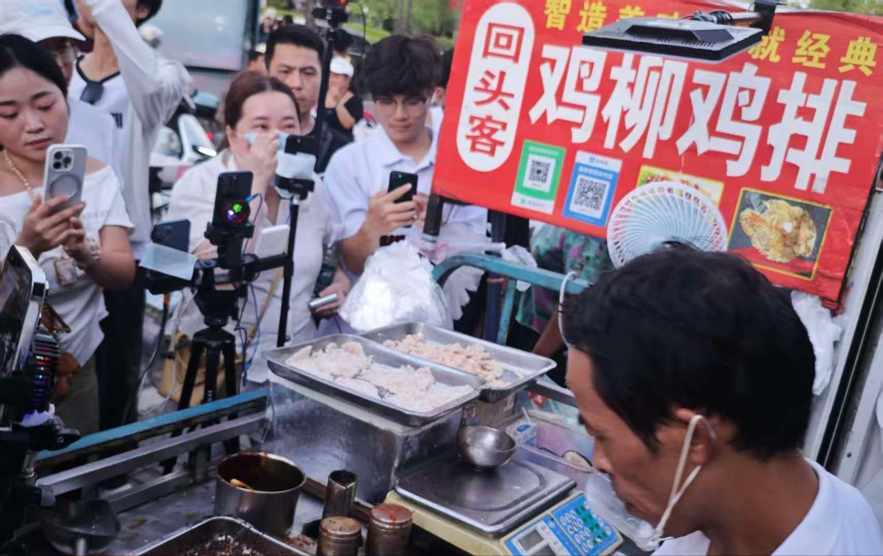 只见鸡排哥骑着三轮车缓缓前行,经典的白色翻领T恤和黑色裤子,双手撑着把手,背后的“回头客鸡排”醒目,几十个镜头蜂拥而上,齐刷刷对准鸡排哥拍。他淡定地停下车,从人群中“劈”开一条小径进入摊位,开始准备。