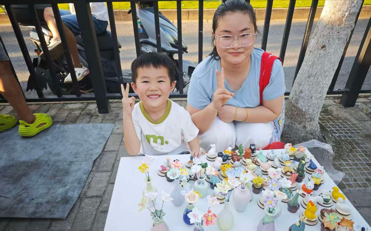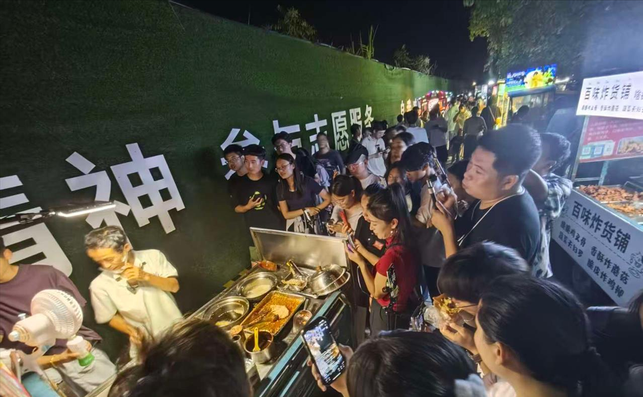 镜头之外,在鸡排哥旁,一整条街的摊贩也来“蹭流量”。“无声萌叔”和妻子有听力障碍,他们的孩子才两岁,正是需要用钱的时候,在抖音上看到鸡排哥爆火,他们从市中心赶过来,下午1点就到现场,在鸡排哥旁边占一个好位置卖现做柠檬水;9岁的男孩带着7岁的妹妹,穿着公主裙卖雪糕,1块钱一根;一位母亲原本是鸡排哥的老顾客,放学后也带着6岁的孩子来摆摊卖小瓷器,“给他赚点零花钱”;一位卖了十几年羊肉串的大哥靠着卖3元一串的羊肉串,供出了一个在陶大读书的大学生……