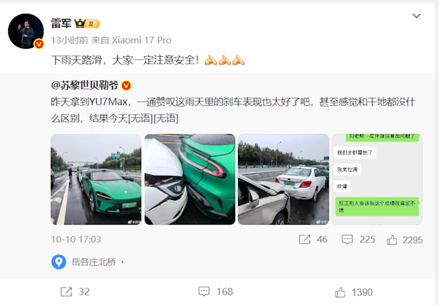 博主赞叹小米YU7 Max雨天刹车太好 和干地都没什么区别:刚说完后被追尾