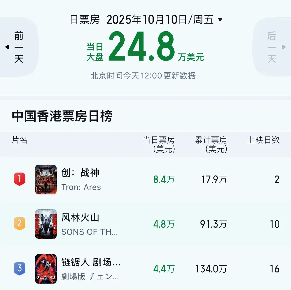 · 上映10天的港产片《风林火山》,累计票房91万美元,当天只捞到4.8万美元;