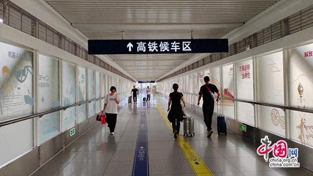 天桥廊道的设计更藏着文化巧思——预留的镂空窗位,不仅是观赏高铁穿梭的“观景台”,更暗合了“留白”的东方美学。当旅客俯身眺望,流动的列车与静态的文化画卷相映成趣,让“等待”不再枯燥,反而成为一场人与城市、人与交通的温柔互动。