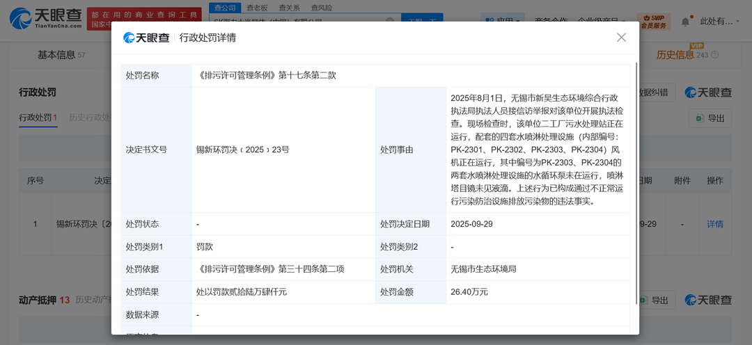 处罚事由显示,2025年8月1日,无锡市新吴生态环境综合行政执法局执法人员接信访举报对该单位开展执法检查。现场检查时,该单位二工厂污水处理站正在运行,配套的四套水喷淋处理设施风机正在运行,其中两套水喷淋处理设施的水循环泵未在运行,喷淋塔目镜未见液滴。上述行为已构成通过不正常运行污染防治设施排放污染物的违法事实。