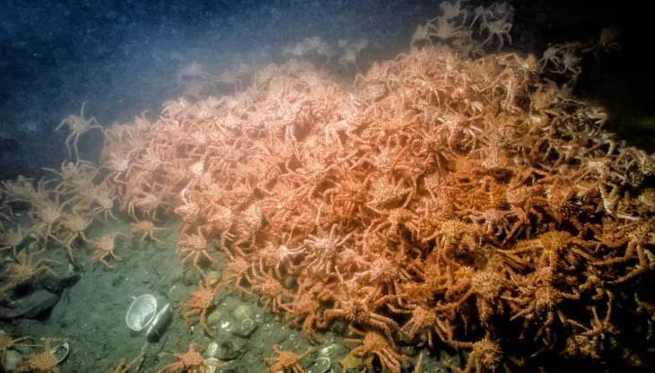 然而帝王蟹的脚步还未停止,它们已经入侵到了极地地区!根据《Proceedings B》期刊的报道,南极海岸帕尔默深海盆地发现了大量的帝王蟹,这是首次在南极洲发现螃蟹,科学家预估该地区起码已经有150万只帝王蟹!