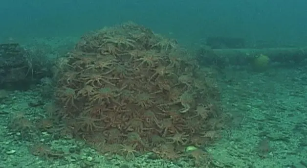它们能出现在这里就是因为全球气候变暖导致的水温上升,虽然现在是位于盆地这个温度较高的区域,但继续这么发展,很快它们就能进入南极洲大陆架!根据拍摄来的素材可以看到,一大堆帝王蟹团成一团,在光秃秃的海底爬行。