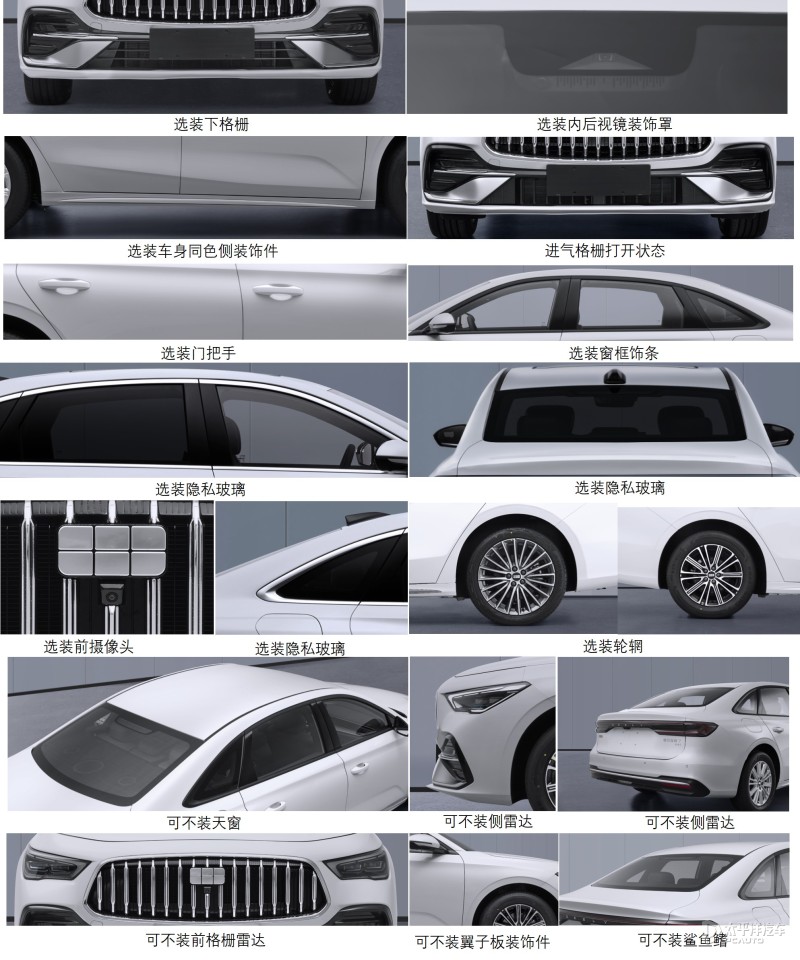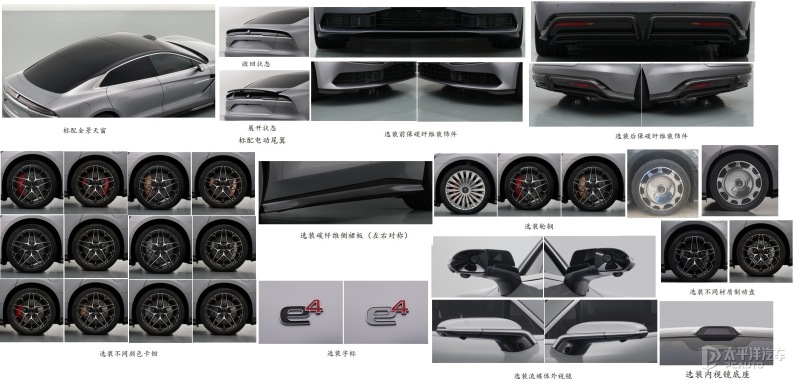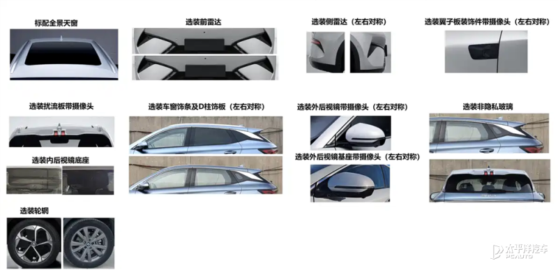 配置上,新车标配全景天窗,同时提供丰富外观选装项,包括前雷达、侧雷达、翼子板及外后视镜带摄像头组件、扰流板带摄像头、内后视镜底座、车窗饰条、D 柱饰板、非隐私玻璃及多种轮辋样式,可满足用户个性化需求。