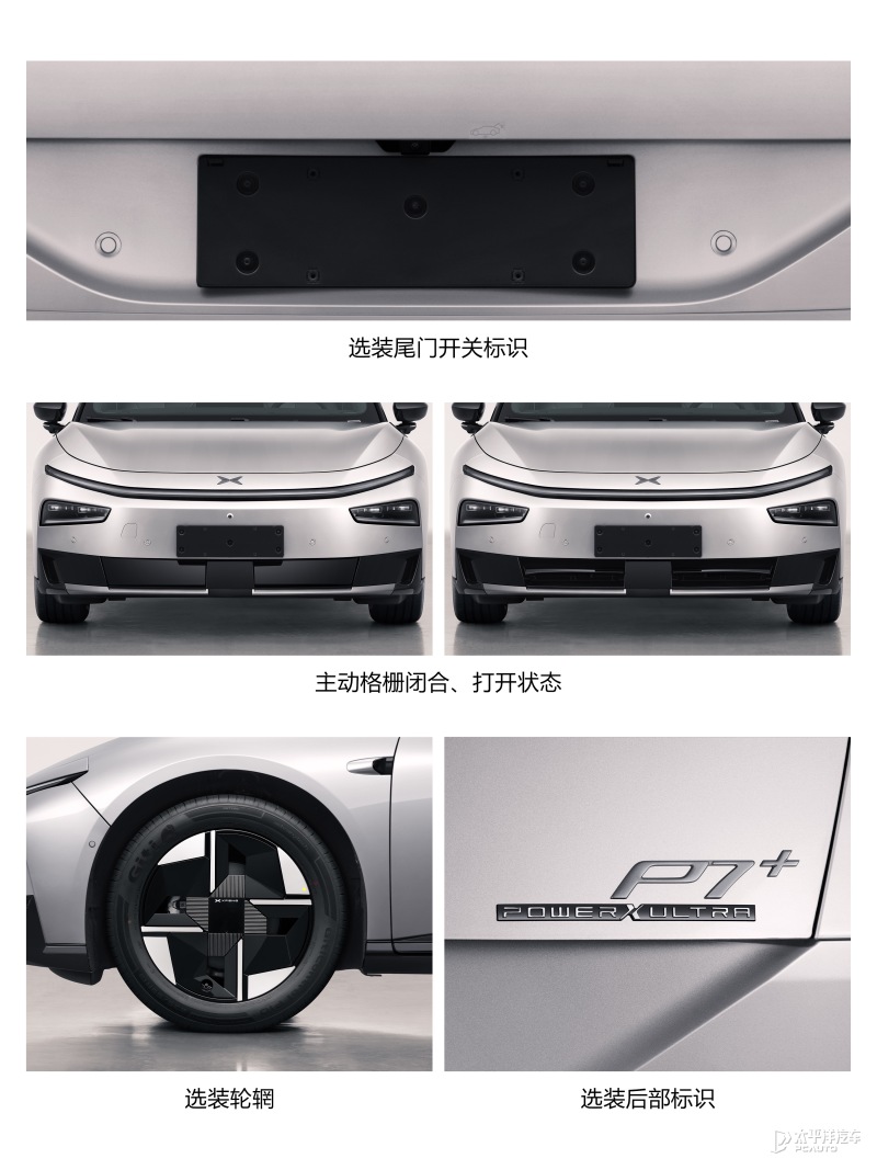 外观方面,小鹏P7+增程版整体延续纯电版车型设计,主要在细节进行区别,其中新车前脸取消下部灯组向下延伸的黑色饰条,视觉效果更简洁,同时配备主动开闭式前格栅,此外,新车新增全新样式轮毂,并提供19英寸和20英寸轮毂可选,对应轮胎规格分别为235/55 R19和255/45 R20。