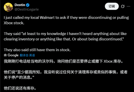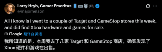 就连Xbox元老(曾在Xbox担任领导23年)Larry "Major" Nelson也发文表态:"本周我实地探访多家Target和GameStop,均发现Xbox硬件与游戏在售。沃尔玛则Xbox Series X和Xbox Series S都有现货。