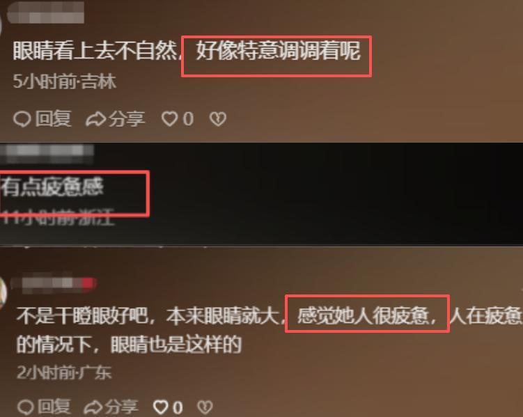 杨颖在整个过程中,都像是极力瞪大眼睛,但就是看起来就是没有神,十分空洞不自然。也有网友认为,也有网友认为是因为她太疲惫了,眼睛本来就大,人在很疲惫的时候眼睛就是这样的。