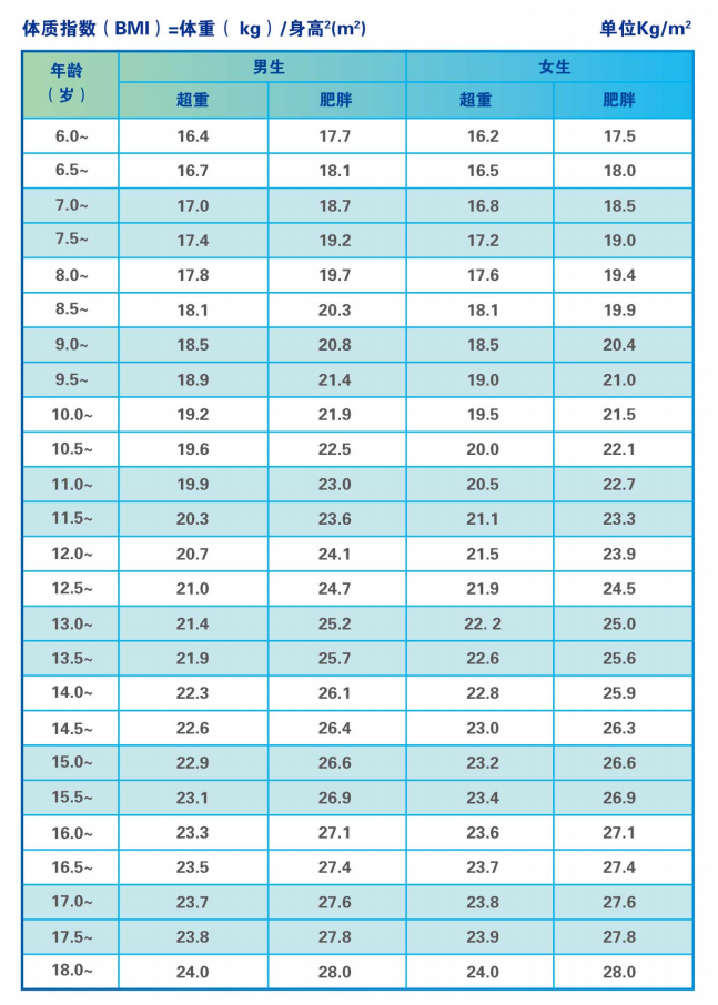 根据年龄和性别,6~18岁儿童青少年的超重和肥胖标准有所不同,可以对照表格进行筛查。
