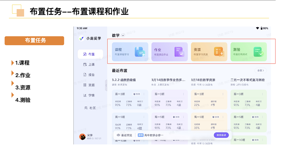 银河智学工作人员透露给「蓝洞商业」的小鹿爱学教师端可以看到,这套系统主要实现课程、作业、资源和测验等功能,老师后台可以看到所有学生的实时学习状态,包括学分、学习内容、进度和答题正确率等,在作业布置完成后,学生的客观题可自动批改,数据汇集之后可以形成精准的学生个人学情报告。