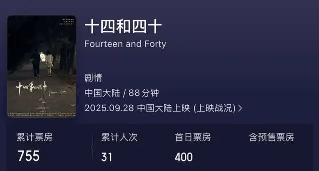 截止10月11号,《十四和四十》上映到目前已经14天了,累计总票房仅755元,全国各地只有31个观众走进影院看过此片!