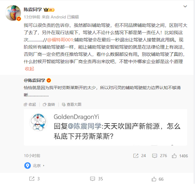 今天早上,陈震进一步补充观点,强调“虽然都叫辅助驾驶,但不同品牌辅助驾驶之间,区别可大了去了”,同时明确“在现行法规下,驾驶人不论什么情况下都是第一责任人,比如我这次……”,间接回应了部分网友对辅助驾驶责任划分的疑问。