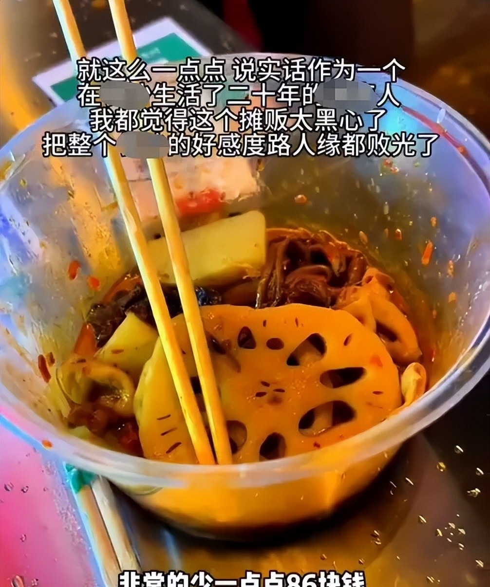 有网友分享其在小吃街上买了一碗麻辣烫,没想到这样一份容量还没过半的麻辣烫花了86元。