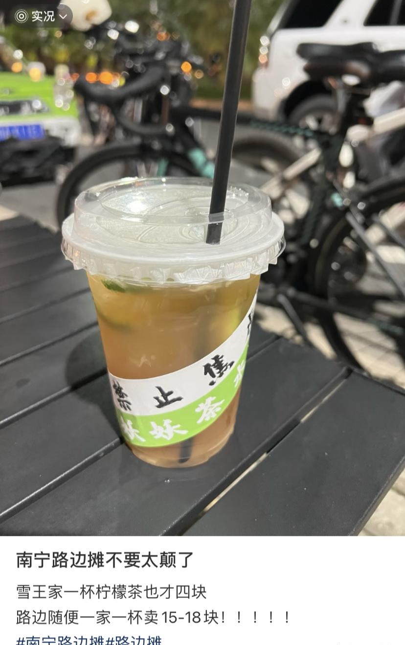 日渐攀升的路边摊价格,甚至比在店里卖得还贵,比如雪王几块钱的柠檬水,路边摊一份所谓的手打鲜榨柠檬茶就要你十几块钱。