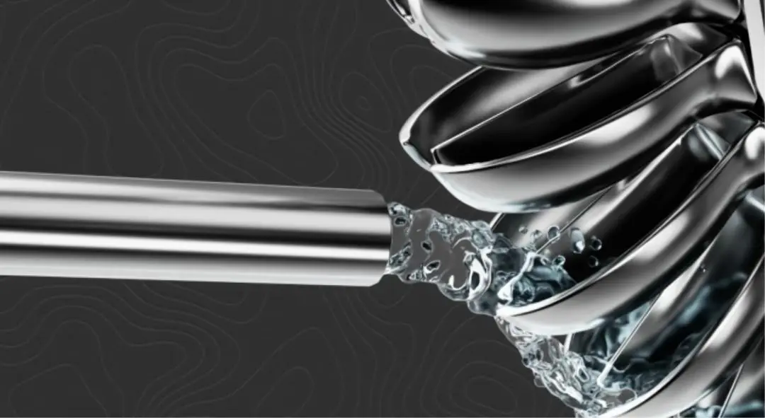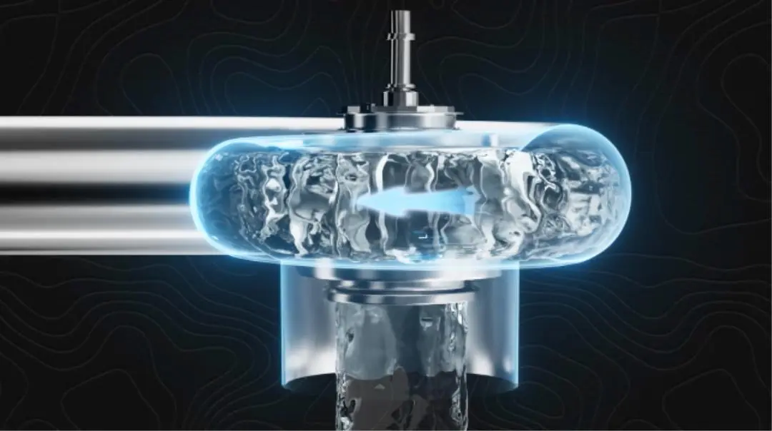 水流会从水轮机四周水平方向向中心流入转轮,然后转为向下方向出口,水流进入转轮时会推动转轮旋转,同时在向下通过叶片时还会再推动转轮一次。