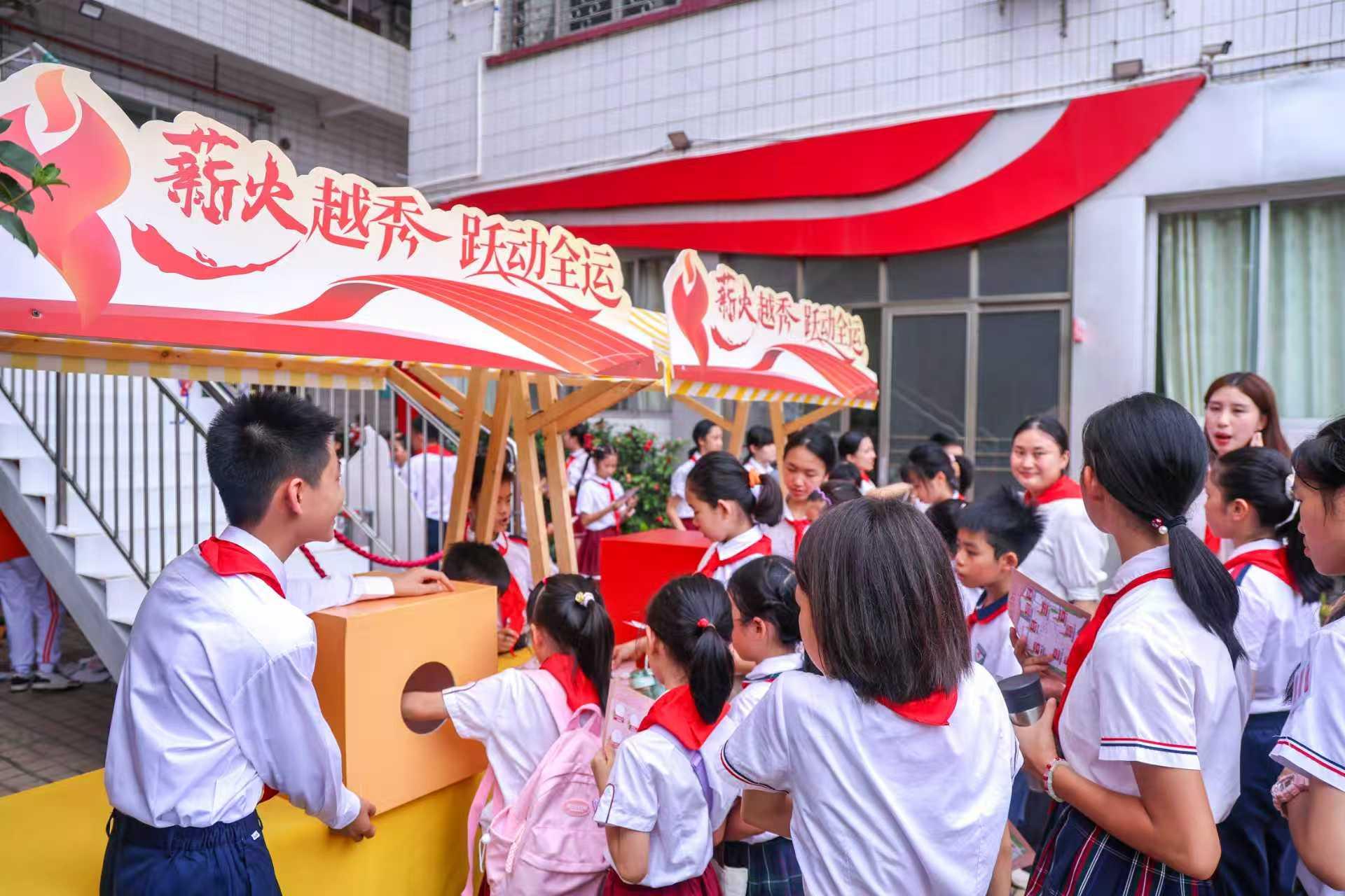 场外,越秀区少先队广场化身为一个巨大的互动体验营,以“薪火传承”“全运聚力”“新程追光”三条主题跑道集中展示了队员们在红色立体研学中的丰硕成果。现场汇集了传家宝作品、红色故事讲解、研学路线图、徽章设计、“全运一招”技能展示、花式助威视频、创意表情包、主题明信片等数千份优秀作品,涵盖绘画、视频、设计等多种形式,涌现出原创粤语童谣《少年强则国强》等一批优秀原创作品。