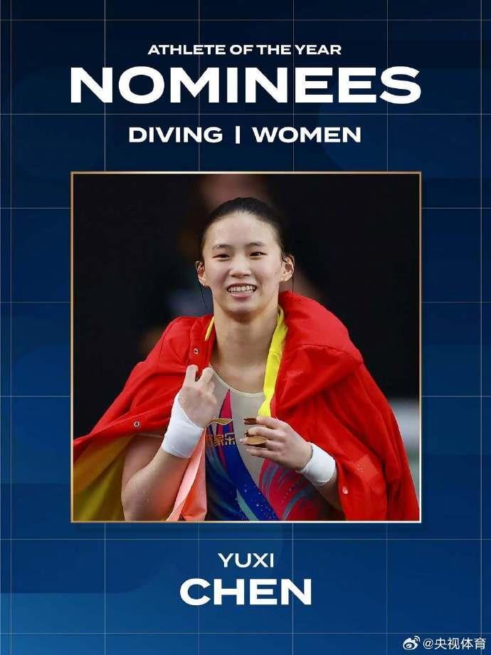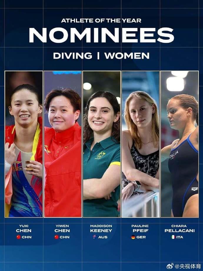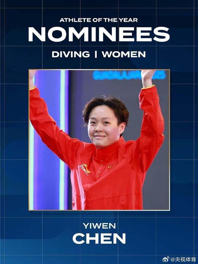 世界泳联公布年度最佳女子跳水运动员候选名单,中国选手陈芋汐、陈艺文入围。陈芋汐凭借在新加坡世锦赛斩获女子单双人10米台及混合团体三金的佳绩,成为奖项的有力竞争者。 (央视新闻)
