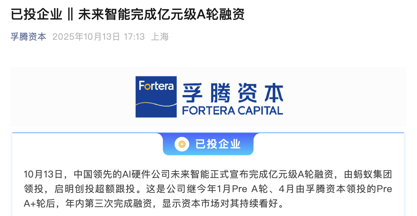瑞财经 吴文婷 10月13日,据孚腾资本发布,中国AI硬件公司未来智能正式宣布完成亿元级A轮融资,由蚂蚁集团领投,启明创投超额跟投。